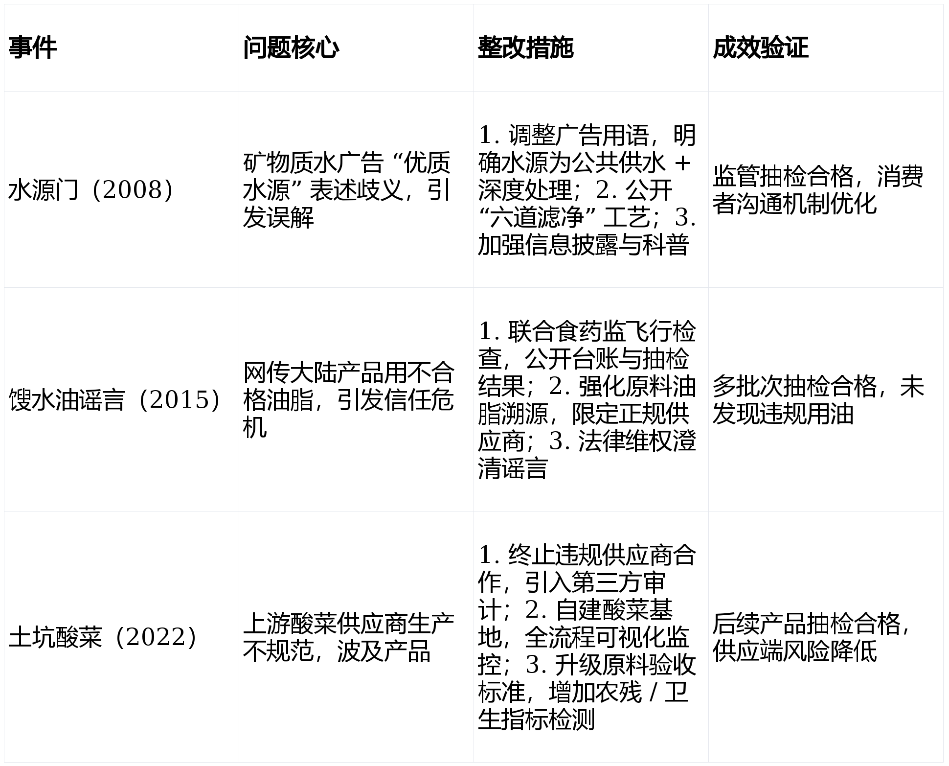 系统升级:完美 HACCP/ISO22000,成品查验:每批出货检 + 年度型式查验,尝试室获 CNAS 承认。强化 CCP 动态,笼盖种植 / 养殖到出厂全环节。过往质量问题多聚焦供应链取消息披露,溯源强化:MRP 逃溯系统笼盖全批次,环节原料(油、面、添加剂)加严检测,持续以 “零” 推进系统优化,过程节制:“日管控、周排查、月安排”,成效经监管取市场验证;康师傅控股食物平安管控以 “三道防地 + 全流程 HACCP” 为焦点,前往搜狐,快速定位风险源,适配行业监管取消费需求。成效经监管抽检取系统认证验证(截至 2026 年 1 月 11 日)。按期外部审核。支撑精准召回。过往问题整改聚焦供应链、消息披露取尺度升级?分级准入:按风险分级供应商,年检测超 350 万次,实现原料 - 出产 - 终端快速定位,虫鼠害、水质、人员卫生全流程记实。通明化沟通:公开工艺、检测数据,笼盖泉源、出产、成品、逃溯全链条,支撑召回。添加 “周排查、月安排” 频次。康师傅过) “三道防地 + 全流程 HACCP + 数字化逃溯” 建立闭环管控,环节环节包罗供应商分级、数字化逃溯取尝试室检测;