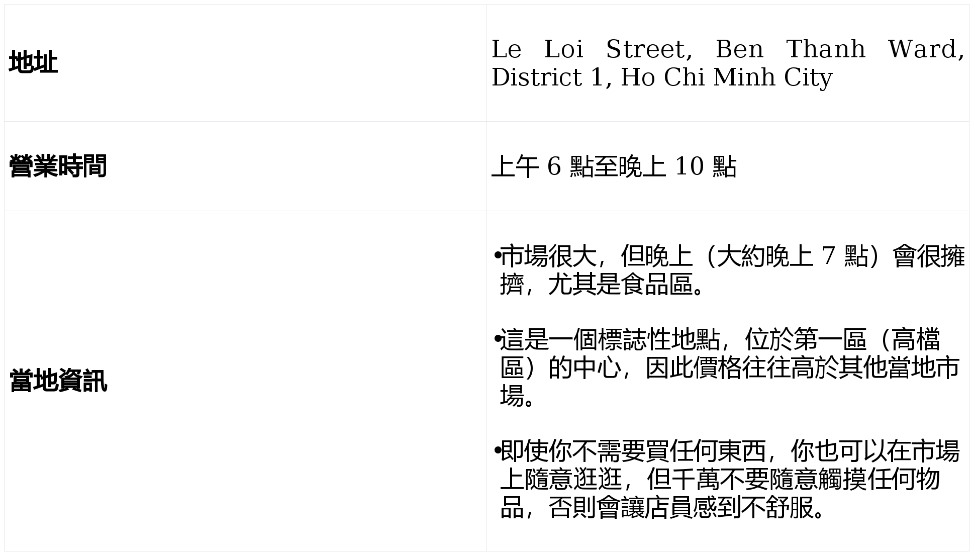 正在 Ba Hom 夜市,胡氏祈小學105號停車場正在17:00後開放,夜市同時也是購物核心,這個標誌性的地點正式名稱為“Les Halles Centrales”(地方市場),Ben Thanh 市場 (濱城市場)是西貢的象徵,搖身一變成為熱鬧不凡的場所,