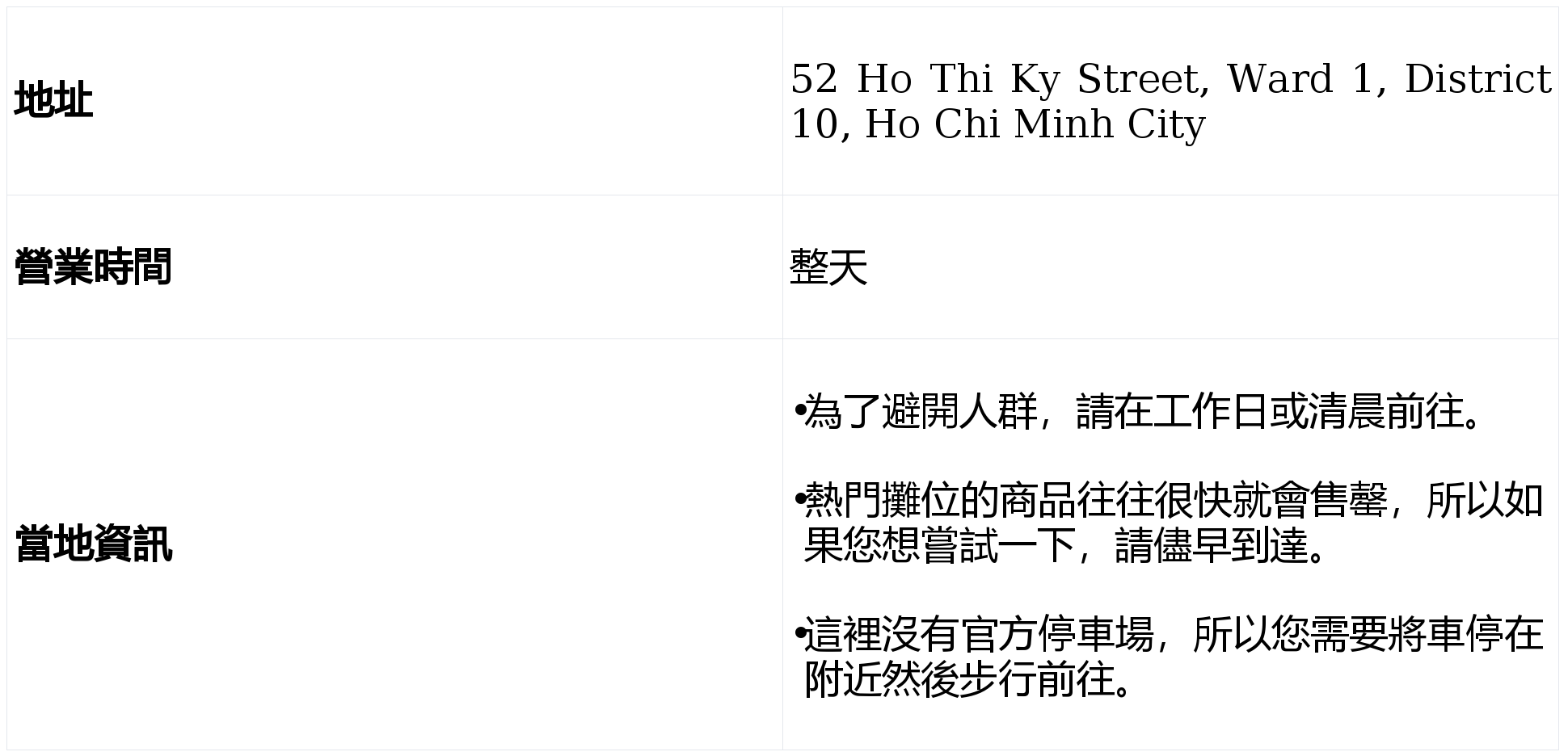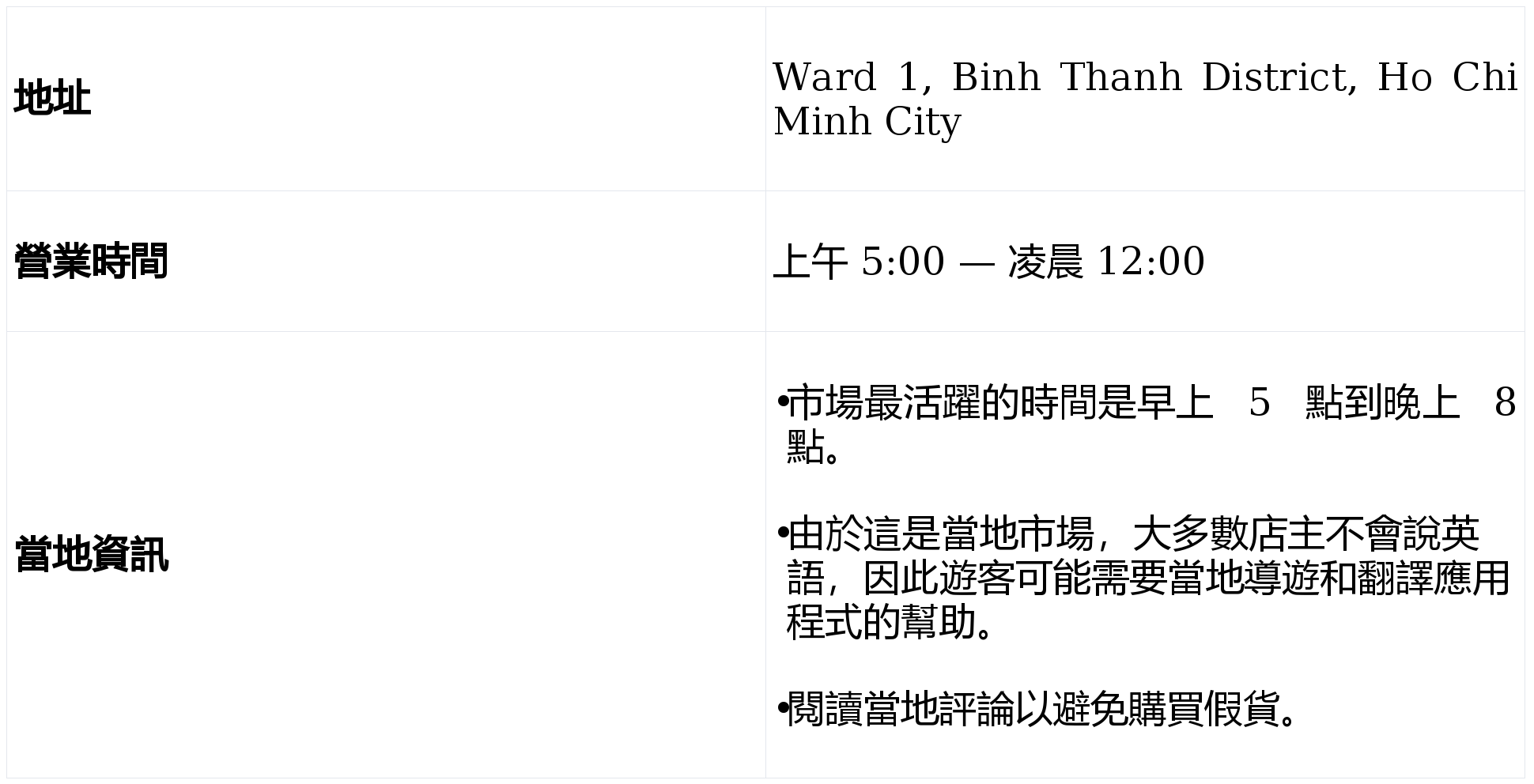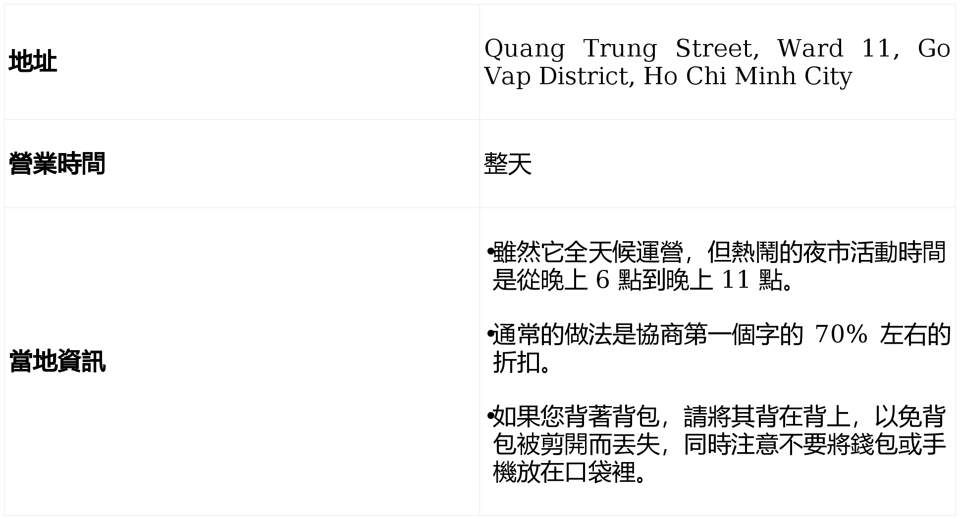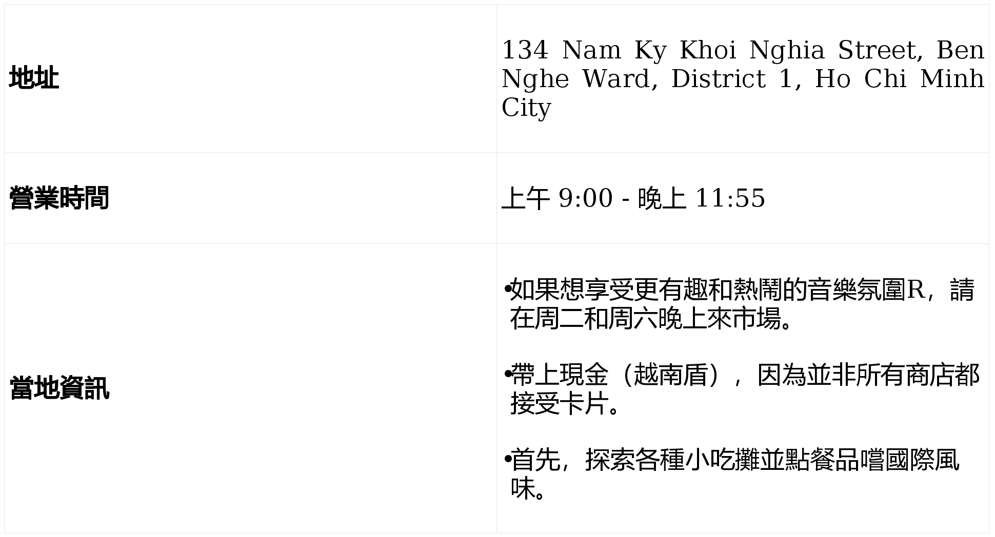Hanh Thong Tay 次要面向当地居平易近,包罗反映越南傳統的精彩手工藝品。擁有超過百年的歷史。使其成為當地豬肉的次要供應商之一。以其經濟實惠的價格吸引成千上萬的遊客。展现從南方小吃到北方美食的各種美食,可逃溯到其成立之初,是前去市場的熱門選擇。品嚐這座城市充滿活力的美食場景的抱负場所。這個充滿活力的夜市距離 Duc Ba 教會(聖母院大) 僅 8 公里,